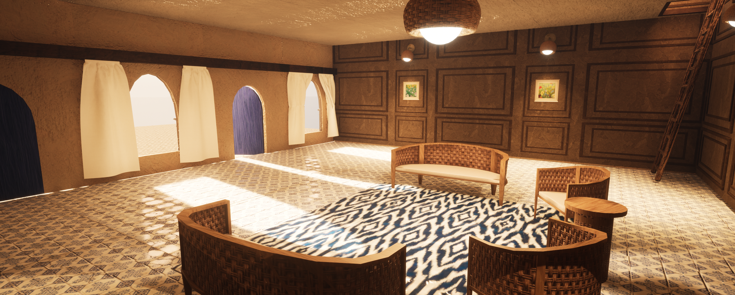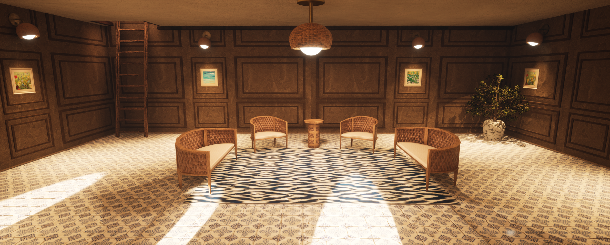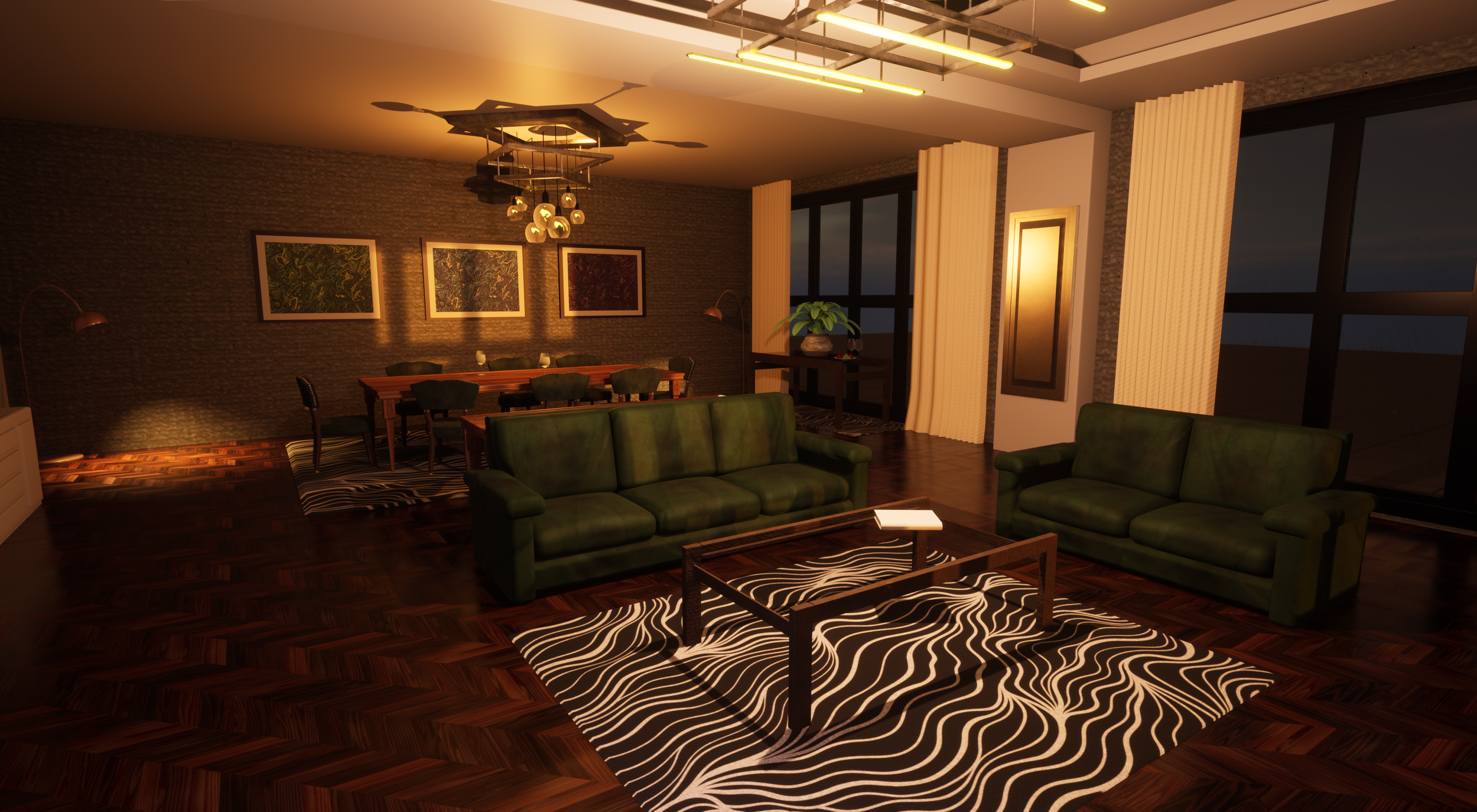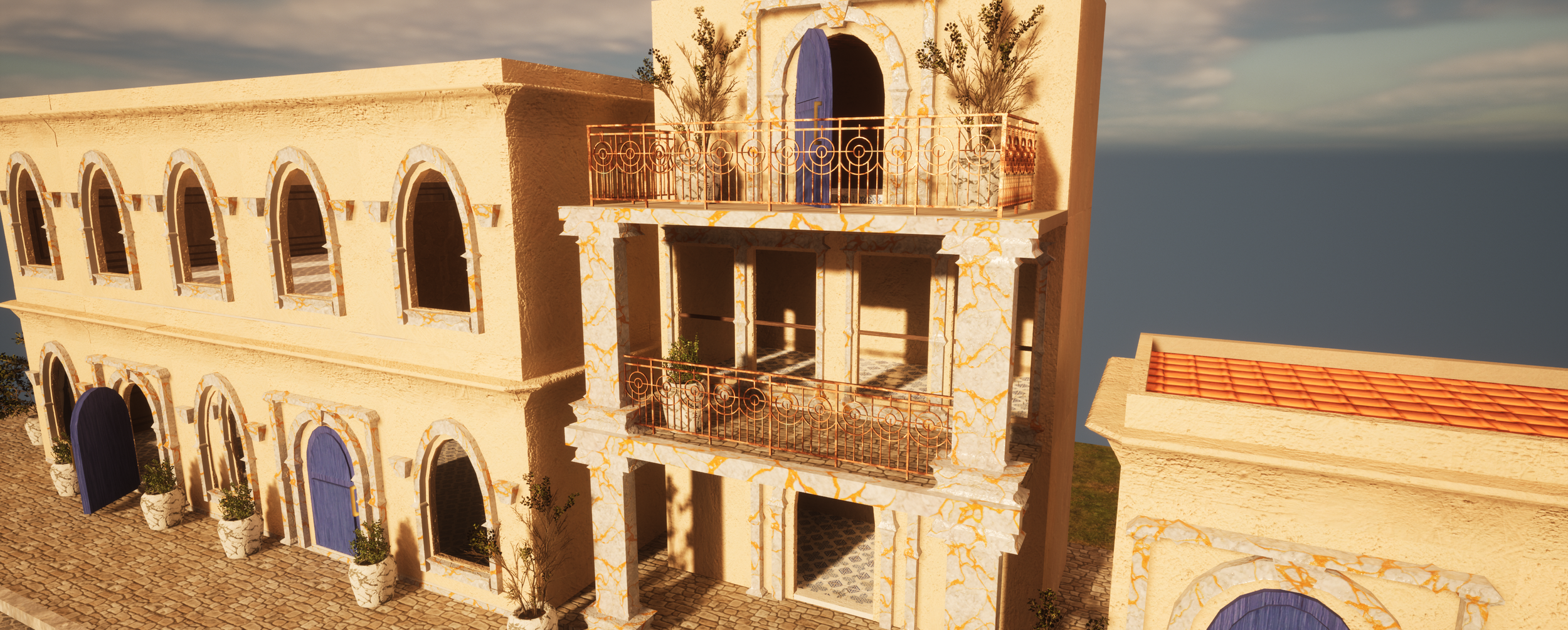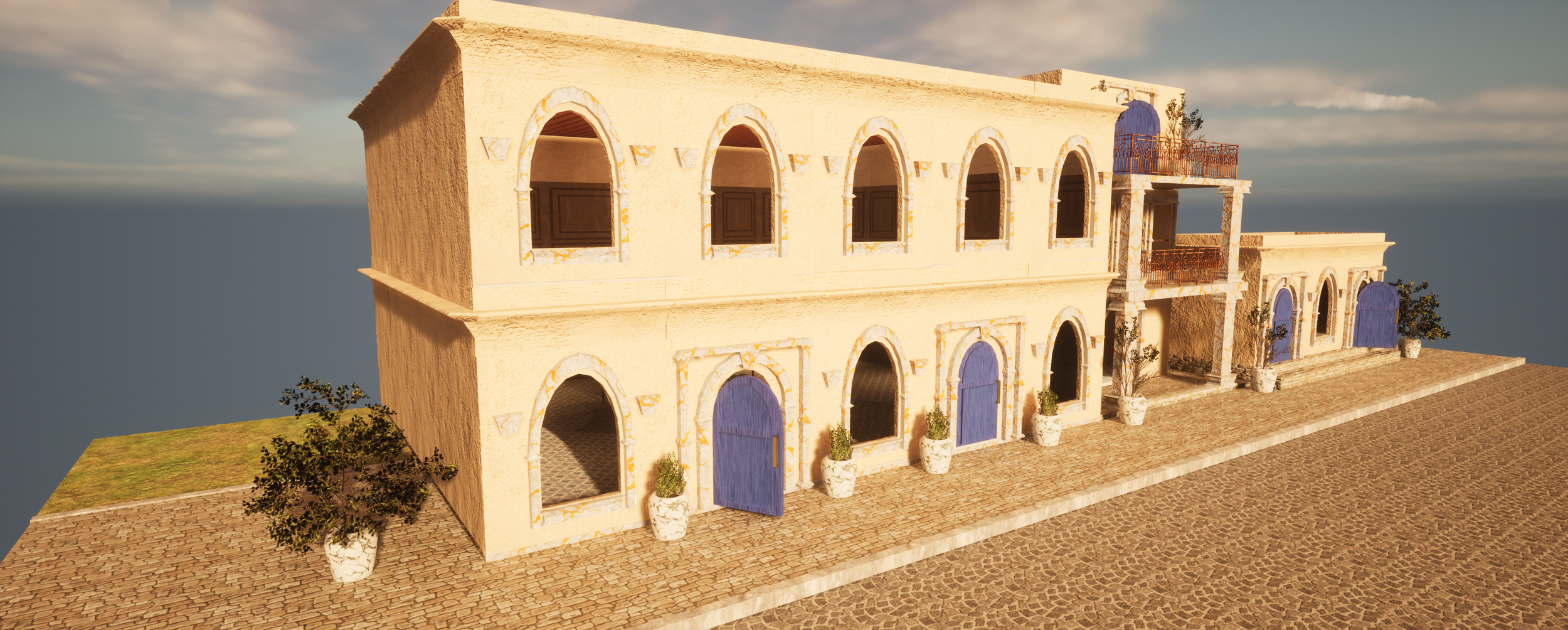This was my final college project where we were tasked with building three different buildings, one furnished on the inside, with different modular elements we modeled.
